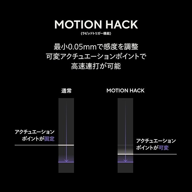 【MOTION HACK機能(ラピッドトリガー機能)搭載】0.1mm~1.8mmの有効範囲において 0.05mm単位で感度調整をキー毎にカスタマイズできます。 さらに設定した有効範囲外でもキーを完全に離し切るまでは、MOTION HACK機能が継続される機能も搭載。 アクチュエーションのON-OFFポイントはスイッチの押し込みや離す動作に対して自動で追従するため、高速連打が可能になります。