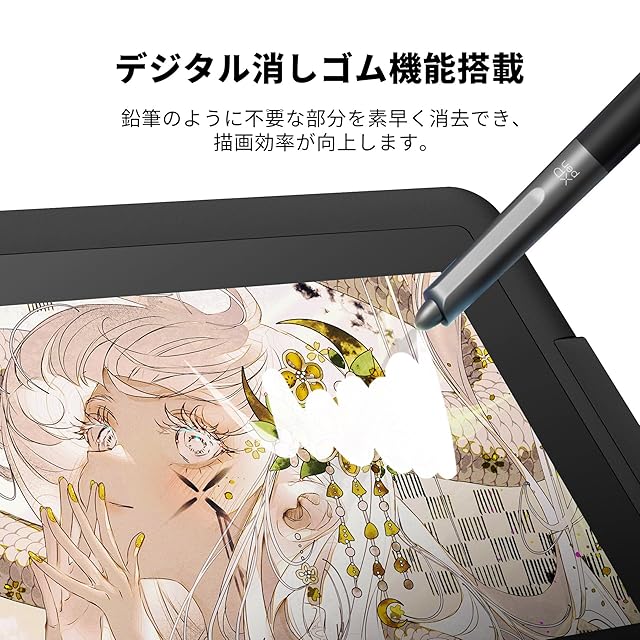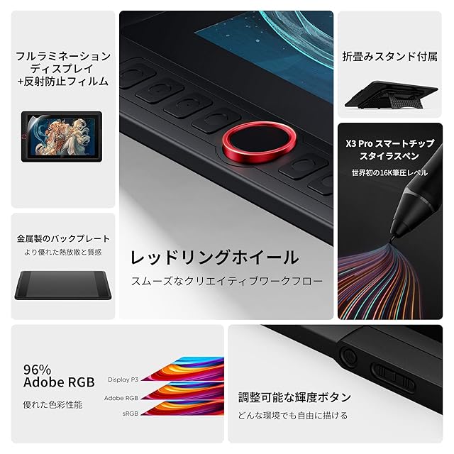フルラミネーションと反射防止フィルムを採用、ペン先とディスプレイの間の空間が減少し、反射を最小限に抑え、紙に描くような操作感が実現される。99% sRGBの色域カバー率と250 cd/m²の明るさで、理想的な描画環境が実現できます。明るさ調整ボタンにより、さまざまな環境でも描画が容易となり、長い時間の創造でも、目に疲れにくいといった特徴を持っています。