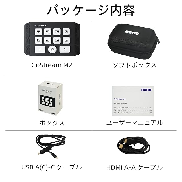 【パッケージ内容とOseeカスタマーサービス】Osee GoStream M2 キャプチャーボード パッケージには、M2 x 1、ソフトボックス x 1、USB A(C)-Cケーブル x 1、HDMIケーブル x 1、ユーザーマニュアル x 1、ボックス x 1が含まれます。Oseeの専門の多言語カスタマーサービスチームがさまざまなアフターサービスの問題を解決しますので、ご不明な点がございましたらお気軽にお問い合わせください。