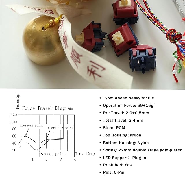 [仕様]動作力:59±15gf、ステム:POM、トップ/ボトムハウジング:ナイロン、プレトラベル:2±0.5mm、トータルトラベル:3.4mm、スプリング:22mmダブルステージ金メッキロングスプリング、LEDサポート:PlguIn、プレルービング:あり