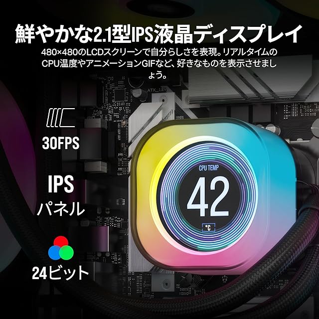 鮮やかな IPS LCD ディスプレイ:解像度 480x480 で、高輝度 600cd/m² バックライト、24 ビットのトゥルーカラー深度、1,670 万色以上の 2.1 インチカスタム IPS LCD スクリーンに、リアルタイムの CPU 温度、お気に入りの GIF アニメーション、とても愉快なインターネットミーム、チームのロゴを表示できます。
