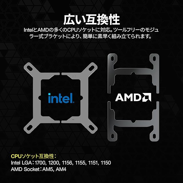 チュービング長さを延長し、簡単な取り付け:400mm まで延長されたチュービング長さと工具不要のモジュール式マウントブラケットにより、LGA 1700、1200、115X と AMD ソケット AM5、AM4 を含む Intel と AMD の最新マザーボードソケットに簡単に取り付けることができます。