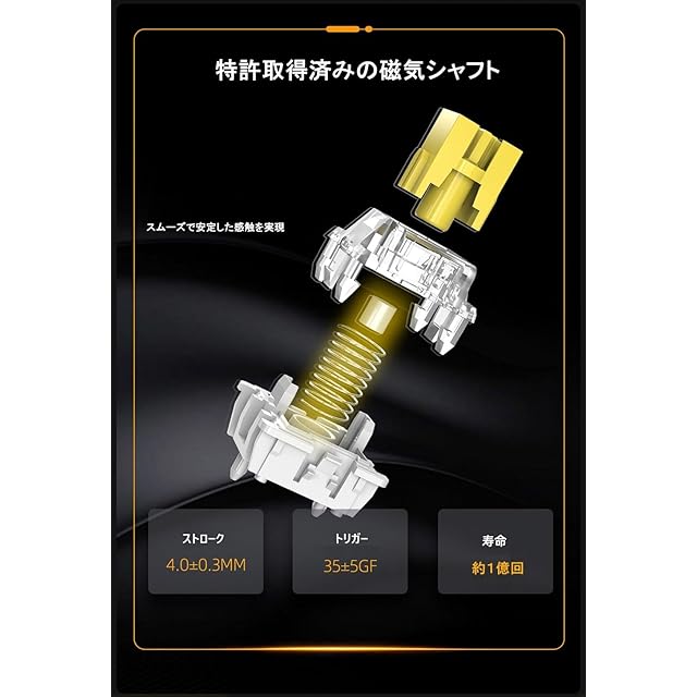 アクチュエーションポイントは0.04mmから4.00mmまでの200段階で、0.04mm単位での細かな調整が可能です。入力遅延は0.3msを実現し、レイテンシは0.6ms、またはスーパー応答モードでは0.2msとなっており、0デッドゾーンを実現しています。圧倒的な精度と迅速な反応により、ゲームプレイにおいてあなたのパフォーマンスを最大限に引き出します。