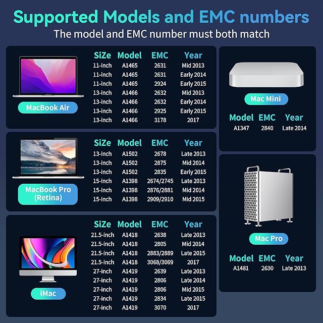 【対応機種モデル】Mac専用 SSDは、macOSのアップグレードに特化して設計されており、以下のモデルと互換性があります: MacBook Air A1465 A1466 (Mid 2013-2015,2017), MacBook Pro A1502 A1398 (Retina 2013-2015), iMac A1418 A1419 (2013-2017), and Mac Mini A1347 (Late 2014), Mac Pro A1481 (2013). ご注意:詳細な対応モデルのリストについては、画像をご参照ください。モデルとEMCは同時に一致する必要があります、そうしないと新しいSSDは認識されません。
