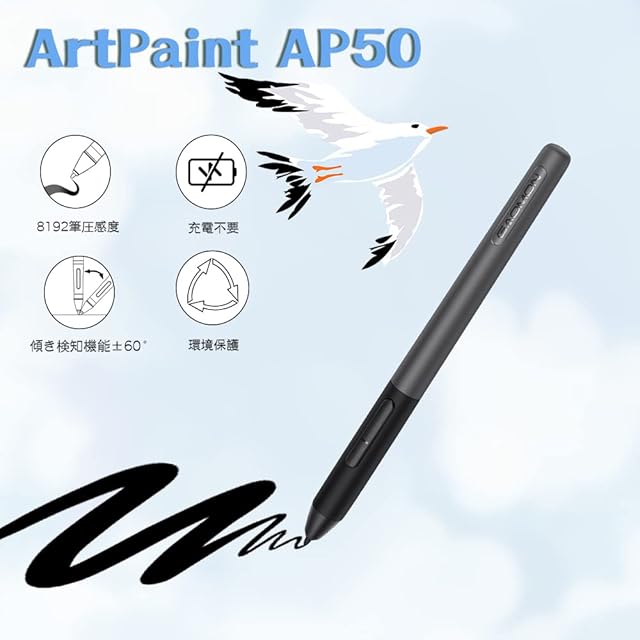 [8192レベルパッシブペン&60度チルト機能対応]--8192レベルの感圧と60度の傾きをサポートするパッシブペンAP50は、アートのあらゆるシャープなディテールを作り出すことができます。 さらに、充電やバッテリー交換の必要はもうありません。