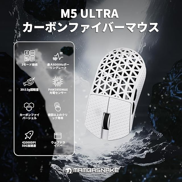 MAMBASNAKE M5Ultra ゲーミングマウス 8K カーボンファイバーマウス 無線 有線 ワイヤレス 軽量 PAW3950MAXセンサー Nordic52840コントローラー 8000Hzポーリングレート 最大42000DPI 3モード Bluetooth 42g超軽量 FPS MOBA コイルケーブル付き グリップテープ付き【公式直営店】(白×銀) | ascend