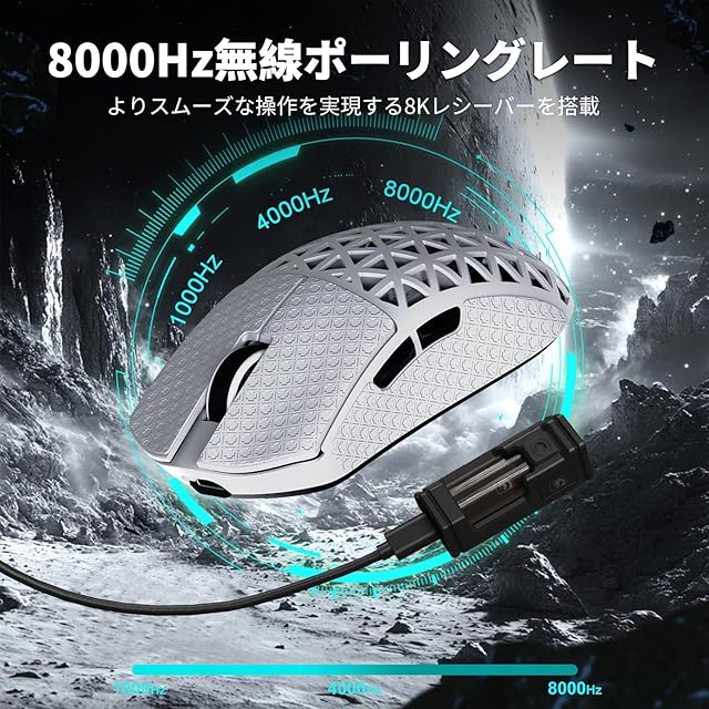 【次世代カスタム8000Hzレシーバー】M5Ultra 8kワイヤレスマウスはNordic 52840チップにより、8000Hzポーリングレートの無線接続を対応できます。8Kレシーバーは、ハイテクな外観に加え、新世代の無線通信技術を使用して8KHz信号をさらに最適化しております。リアルタイム応答性が向上し、ゲームパフォーマンスを最大限に引き出します。(レシーバーを使う場合のみ8Kポーリングレート対応できます)