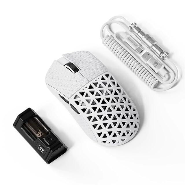 【3モード接続&プレミアム付属品】M5Ultra 3モードゲーミングマウスはBluetooth、2.4Ghz無線、USB-C有線三つの接続モードを備えております。XP、Win10/11 Mac OS、Linux対応、接続モードを切り替えることで、複数のデバイスを素早く切り替えることは可能です。230mAhバッテリーで60時間のワイヤレスゲームに対応、専門コイルケーブル付きで安定した接続を確保できます。グリップテープは、よりスムーズで楽な動きを実現すると同時に、優れた制御性を維持し、力の調整と停止能力を向上させます。