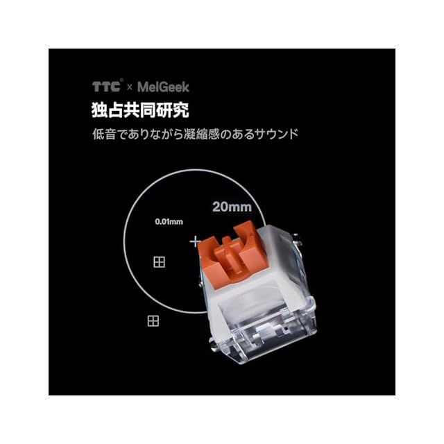 【MelGeek x TTC専用スイッチ】TTC Tai Eスイッチは一体型のソフト弾性構造で、ノイズを低減し、高反発の押下感を実現。サウンドは比較的鈍く集中しており、安定した極端なパフォーマンスを追求し、HIFI タイピング サウンドを好むプレイヤーに適しています。