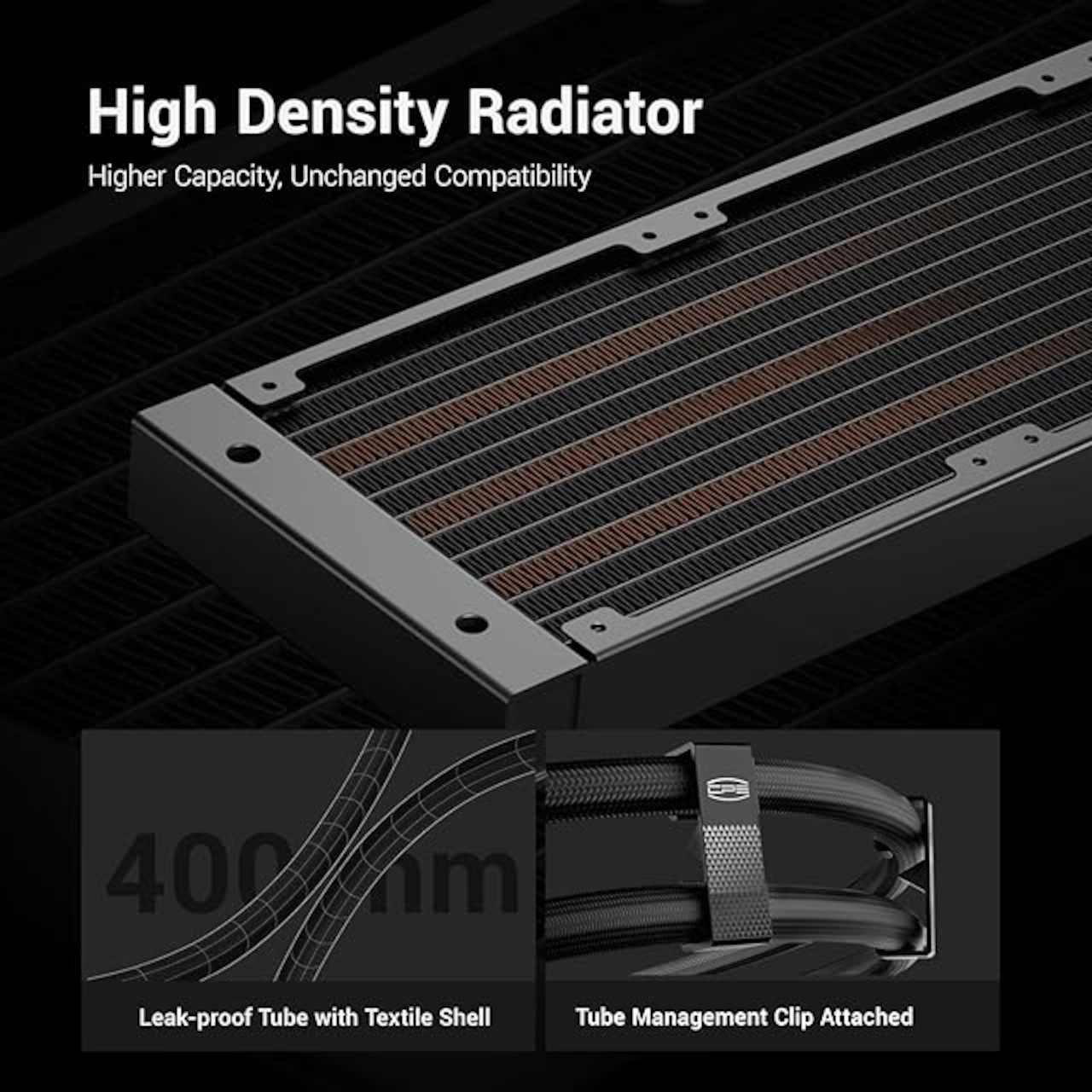 【360mm大型ラジエーターで高効率冷却】 冷却効率に優れた360mmサイズのアルミニウム製ラジエーターを採用。冷却面積が広く、長時間の高負荷使用にも対応できる安定した熱処理を提供します。