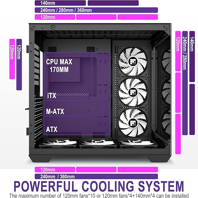 【超大容量】ケース内のスペースはコンポーネントごとに構成されており、新しいコンピューターコンポーネントと完全に互換性があります。(1)ATX/M-ATX/ITXマザーボードをサポート (2)360MMクーラーをサポート (3)CPUクーラーの高さ170MM (4)GPUの長さ制限400MM (5)最大220MMの電源タイプATX (6)1 * HDDと1 * SSDマウントまたは(2 * HDD)を装備 (7)拡張スロット7 + 3個