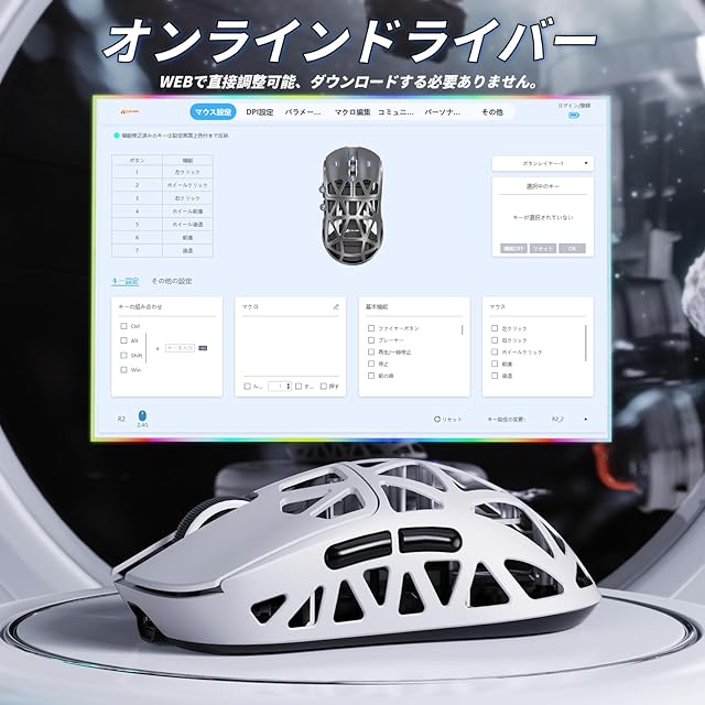 5.【オンラインドライバー】この超軽量ゲーミングマウスは、ダウンロードする必要のないオンウェブドライバーをサポートしています。接続状態でhttps://www.qmk.top/を開くだけで、システムはマウスモデルを識別し、webドライバーでマウスの様々な機能を直接調整することができます。このドライバページでは、マウスマクロの編集、DPI、ポーリングレート、リフトディスタンスなどの設定ができます。この3モードマウスは、Windows Xp/Windows7/8/10/11/Linux/Macos/ios/Androidなど、様々なOSに対応し、PC、デスクトップ、ラップトップ、MacBookに対応しています。(マウスの充電電流は100mA、付属の USB ケーブルを使ってパソコンの USB ポートに接続して充電してください。バッテリーの損傷を避けるため、マウスをプラグなどの大電流電源に直接接続しないでください。)