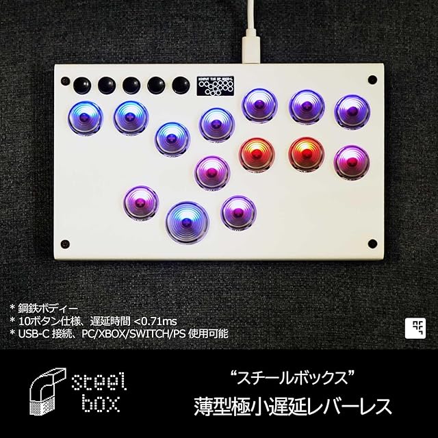 <b>✅ 特徴 1 - 高強度のスチール(鋼鉄)でボディーを作りました。</b><br/> 通常の使用では曲がりにくい、壊れにくいです。 ミニマルカラー、薄いミニマルデザインでどんなデスクにもよく似合うようになっております。 ホワイトボディーにパウダーコートで仕上げ、手触りがとても良く、指紋等などの汚れにも強いので 掃除も簡単、長らく綺麗に使えるものとなります。 <br/> <br/> <b>✅ 特徴 2 - 2つボタンが追加し10ボタン型にしました。</b><br/> CPT基準でもオッケー、音ゲーにも無理なく使えるレイアウトになります。 PCのブラウザーから設定画面に接続することで、ボタンはどれにでも設定することが可能です。 ボタン組み合わにより、簡単にSOCD設定を切り換えることができますので、SOCD-Xにしてキーボードモードに接続させると、 音ゲーでも抜群に使えるようになります。 ※出荷時設定はSOCD-Nと設定されています。SOCD切り換えのボタン組み合わせは 国語マニュアルをご参照ください。 <br/> <br/> <b>✅ 特徴 3- 薄型で違和感のないレイアウトとデザイン。</b><br/> コンパクトで薄型の設計にしながらも、普通のレバーレスコントローラーの操作と違和感を感じないように ボタンの大きさから配置まで微調整しました。 どんな大きさのデスクからでも、どんな大きさの手でも楽に使えるサイズとなります。 さらに、薄くコンパクトで携帯も自由。多目的デバイスになります。 <br/> <br/> <b>✅ 特徴 4 - さらにあらゆる便利な機能を搭載。</b><br/> 極小遅延のGP2040ファームウェアをカスタマイズして採用しました。PCでならなんと最小0.4msの遅延時間を持ちます。 PC/XBOX/SWITCH/PSにお使いできます。遅延時間は機器ごとに異なる場合がありますが、それでもほかのコントローラーに 比べると抜群となります(PS4の場合い1.4ms)。 8ボタンに対してはボタンごとに連射機能が付いていて便利に使えます。 1秒ごと15回~30回連射速度を設定することが可能です。 <br/> <br/> <b>✅ 特徴 5 - 独自設計・製作した基盤を使っています。</b><br/> 同じRP2040でもスチールボックスには過電流、逆電流、ESD(清電機放電)プレテックションが実装され、 もっと安全に、長くコントローラーを使うことができます。 <br/> <br/> <b>✅ 特徴 6 - 高級機械式キーボードで使われる構造を採用しました。</b><br/> 最高の手応えとレトロな打音を実現しました。 KAILHさん LOW PROFILE V2 スイッチをFR4プレート基盤で支え、その間にミュートフォームを埋めてあります。 タッチ感と使い心地のため、キーキャップは22mmと25mmを混用しました。 両手で使うことの多い↑ボタンが25mmボタン仕様になっております。 <br/> <br/> <b>✅ 仕様</b><br/> -210mm x 120mm x 15mm, 700g<br/> -独自RP2040基盤 (電気保護回路内臓)<br/> -USB-C 接続<br/> -Kailh Low Profile Switch v2<br/> -GP2040-CE(modified) ファームウェア<br/> <br/> <br/>