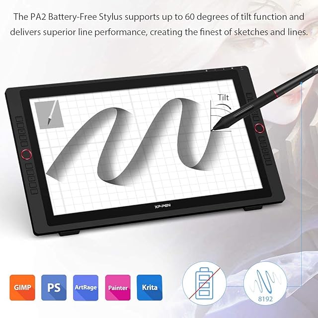【Artist 24 Pro液タブ仕様】①付属のバッテリーレスペンは最大60°の傾き検知をサポート、8192レベルの筆圧感知、繊細なタッチ、精度、レスポンスを実現。 ②2個のホイールと20個のカスタマイズ可能なショートカットキーが搭載、右利き・左利き両対応。③16~90°の角度調整可能な内蔵スタンド、お好みに合わせて快適に作業。④保護フィルム着装済みで、画面をキズや衝撃から保護します。 ⑤対応OS:Windows、Mac。