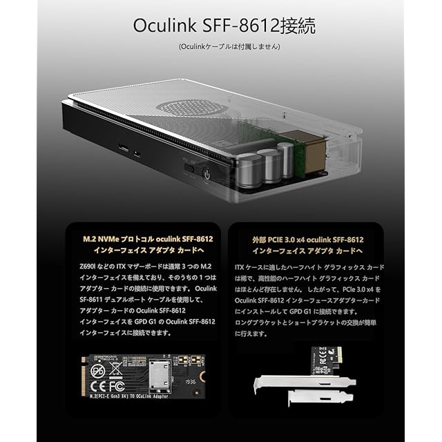 『Oculink√ USB4』GPD社の対応製品他、eGPU対応のPCであれば(USB4もしくはThuderbolt3/4)対応可能です。接続したPC本体に65Wの給電を行えます。Oculinkポートを搭載し、最大63Gpsの転送速度で使うことができます。ご注意ください:Oculink と USB4 はどちらもグラフィックス カードと 3 つのビデオ インターフェイス出力を担当できますが、Oculink はデータ送信をサポートしていません。USB4 と Oculink デュアル ポートを同時に接続してパフォーマンスを最大化します。