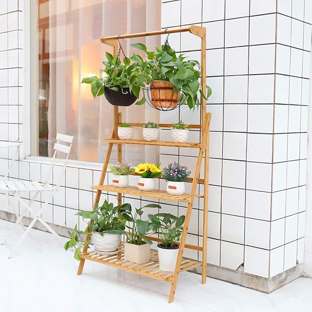 UNHO フラワースタンド 天然竹製 ガーデンラック 3段 幅70cm ハンギング 吊り下げ フラワーラック 園芸ラック 植物棚 多肉植物 棚 ベランダ 植木鉢スタンド 鉢 プランター 花台 | ascend