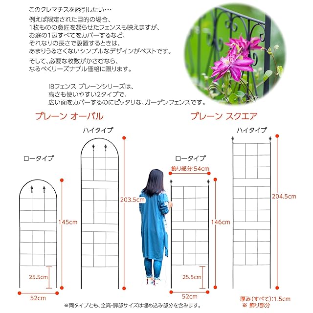 サイズ: 高さ146cm×幅52cm ※フェンス下部埋め込み可能部分約25.5cm ※最大厚み(飾り部分)1.5cm