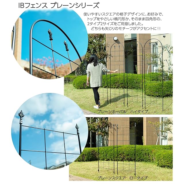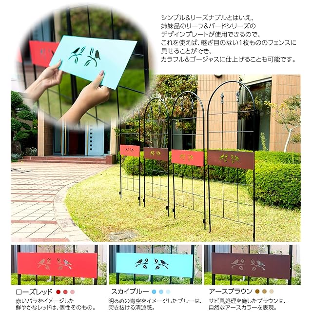 お庭をエレガントに彩るIB(アイビー)フェンスシリーズにシンプルでクラシカルなプレーンシリーズが登場!!つるバラなどの植物を誘引すればお庭をダイナミックに演出できます。カラーはシックなブラックなのでお花の色彩や緑を鮮やかに引き立てます。フェンスに装着できるレトロカラーのデザインプレートもご用意しています。品番→ IBF-PL5215-2P-RED IBF-PL5215-2P-BLU IBF-PL5215-2P-BRN