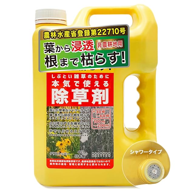 【✅散布しやすい注ぎ口シャワータイプ】扱いが簡単な注ぎ口がシャワータイプになっているので、広い場所にすばやく散布できます。詰め替えたり別途散布器を用意する必要がありません!4Lで約100~200平方m散布できます。(約30~60坪)