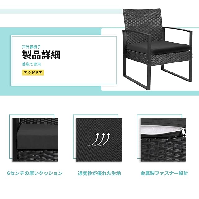 [耐久性と快適性を兼ね備え]:椅子の部分は上質なPE籐材料と頑丈な金属フレームで作られています。籐材料は防腐処理を経て耐久性が上がり、丈夫で切れにくい。あらゆる天候に対応し、より長い時間を使うことができます。また、柔らかい座布団も付属して、椅子の快適性においてもまったく劣らない。