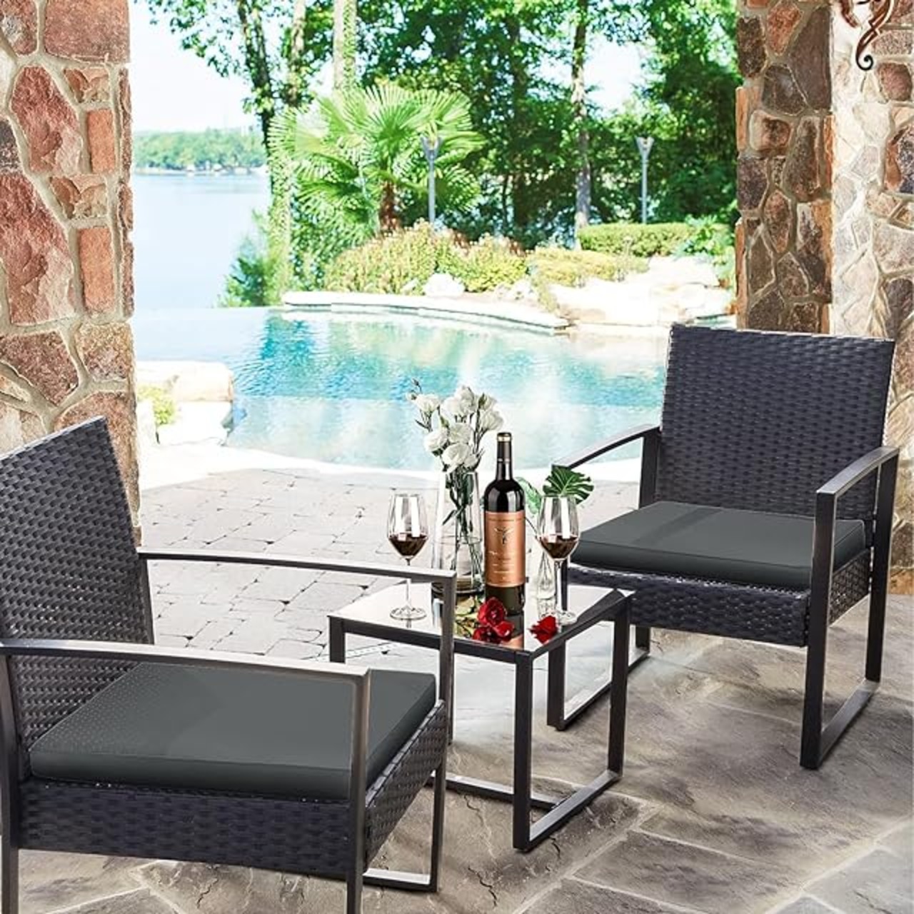 Alebert「アレベルト」 ラタン調 ガーデンファニチャー ガーデンテーブルセット テーブルセット 3点セット ベランダ 椅子 テーブルチェア ガーデンチェア アウトドア 2人用 耐水 耐熱 耐日光 おしゃれ 組立簡単 ベランダ/庭/プールサイド/室外用 四季通用 (Black) | ascend