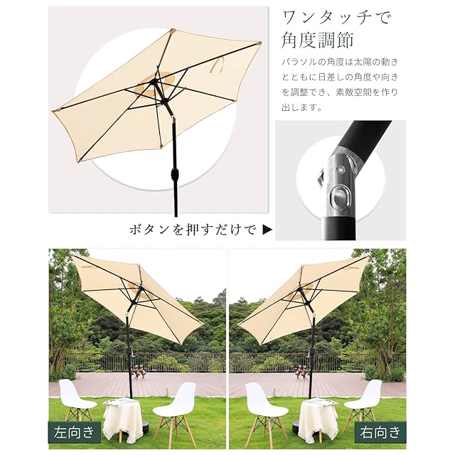【角度調整で一日中快適に日除け】太陽の位置に合わせてパラソルの角度を左右に自由に調整可能。朝から夕方まで日差しをしっかりカットし、常に快適な日陰スペースを確保します。
