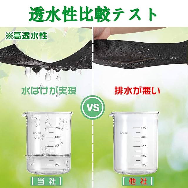 【抜群な遮光】高品質の耐候性不織布を採用して、99.11%日光を遮り、雑草を生きにくいです。光を遮ることで光合成を防ぎ、除草剤を使わずに雑草の繁殖を防止します。水や空気、液体肥料を通すので植栽もできる防草シート(雑草防止シート)です。 除草剤に頼らないため、大切な庭木や花壇などの枯らしたくない植物に影響しません。安全性の高い雑草対策です。ていくうちに自然と水になじみ、通水効果も上がります。 雨天時の通水性も優れており、水たまりになることも無く快適です。