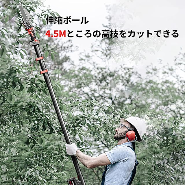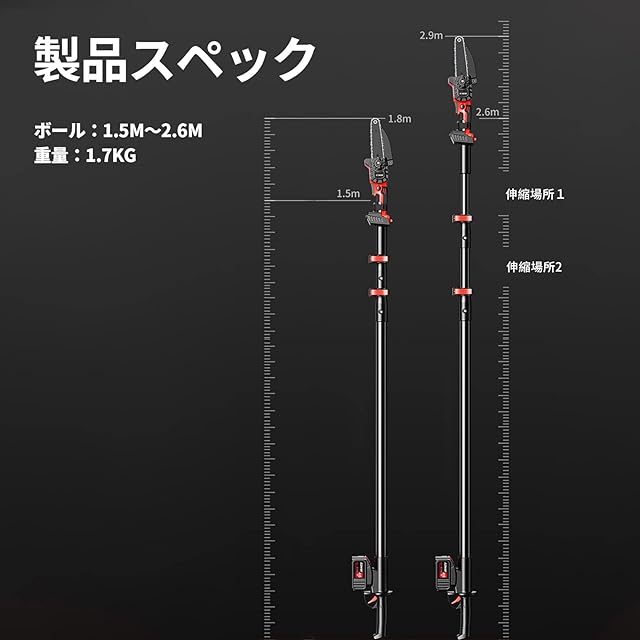 2ヶ所伸縮できますので、長さは1.5m~2.6まで調整できますので、地面から4m~4.5m所の高枝がカットできます。