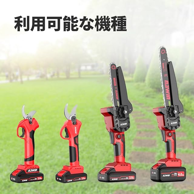 対応製品 ①6インチと8インチチェーンソー型番:NA-20DLJ(給油タンクなしモデル)、自動給油モデルのチェンーソーがご利用できませんので、要注意ください。 ②電動剪定ハサミ(NA-20DJD・NA-20GZJ)