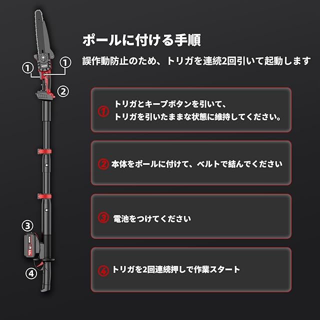 【操作簡単】チェーンソーをトリガーキープ状態に設定し、バッテリーを付けてトリガを2回連続引いてスタートします。操作詳細は商品写真ページにてご確認ください。