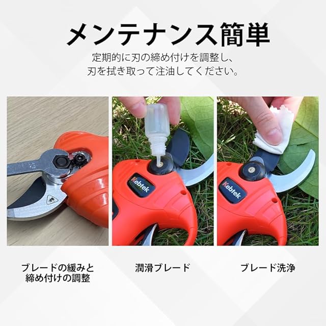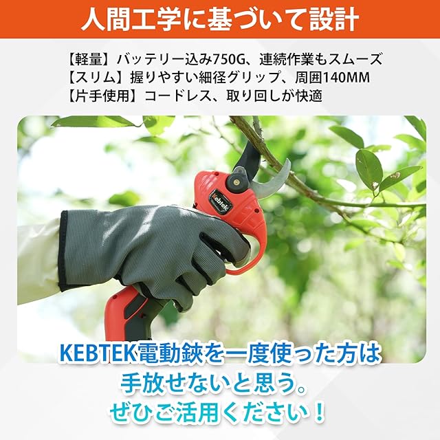 【1日の作業に十分な大容量電池】:Kebtek電気剪定鋏は大容量4000mAhのリチウムイオンバッテリーが内蔵されています。フル充電後、6時間連続作動できます。外出作業は困ることがありません。1日の剪定作業に十分です。