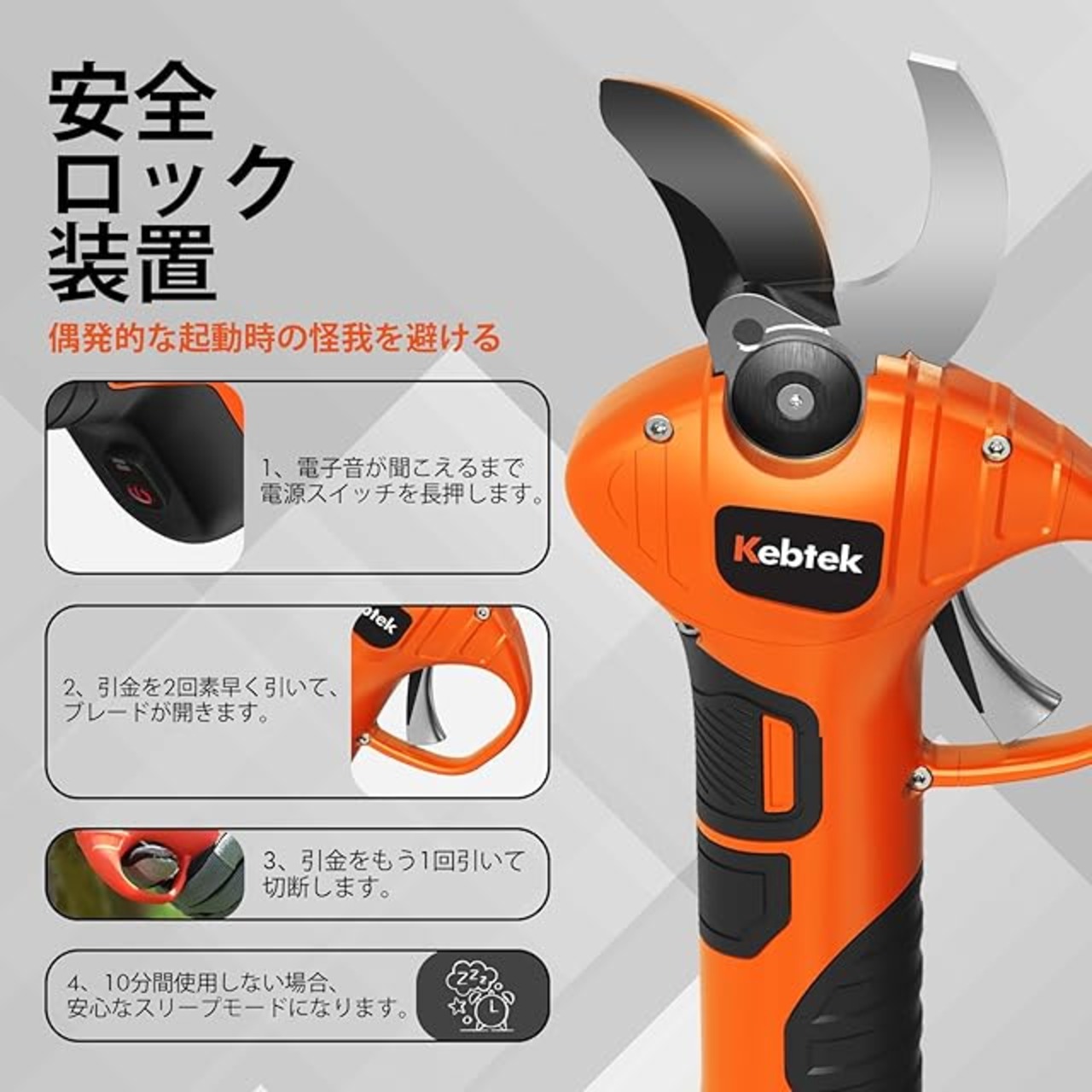 【安全装置付き】:誤操作による事故を防ぐために、安全装置を採用しています。電動鋏の刃を開くために、電源スイッチをオンにした後、引金を2回すばやく引く必要があります。
