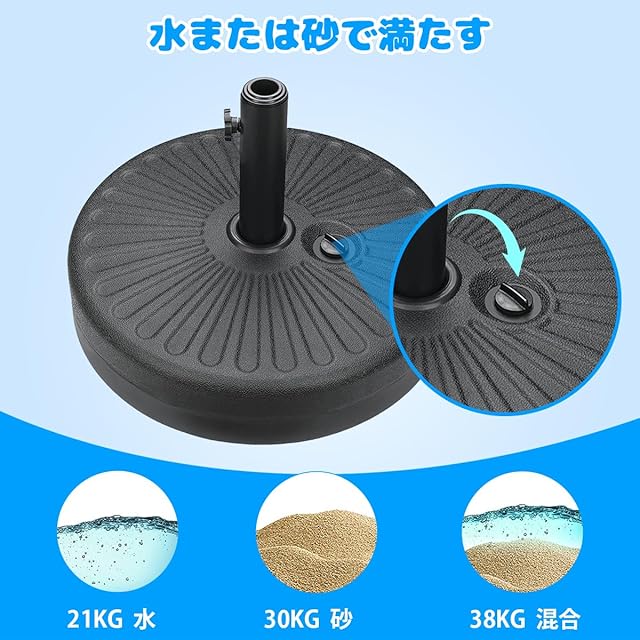 使用範囲:傘柱直径が38mmのガーデンパラソルをサポートします。可能であれば、ベースに砂を入れることをお勧めします。これにより、ベースがより安定します。