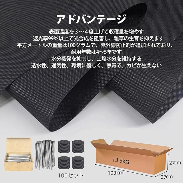 【商品詳細】 園芸用 シート不織布サイズ:2m×50m、重量:約10000g。 また、スチールUピン100本と黒丸100本を併用することで、より便利に設置できます。両面使える