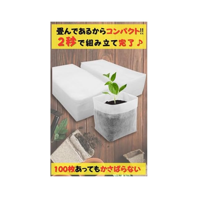 【環境に優しい】この不織布ポットは、軽量でコンパクトなデザインが特徴です。100枚セットで、土を入れると直9×9×18㎝の4号深鉢タイプになります。環境に配慮した素材で、持続可能なガーデニングをサポートします。