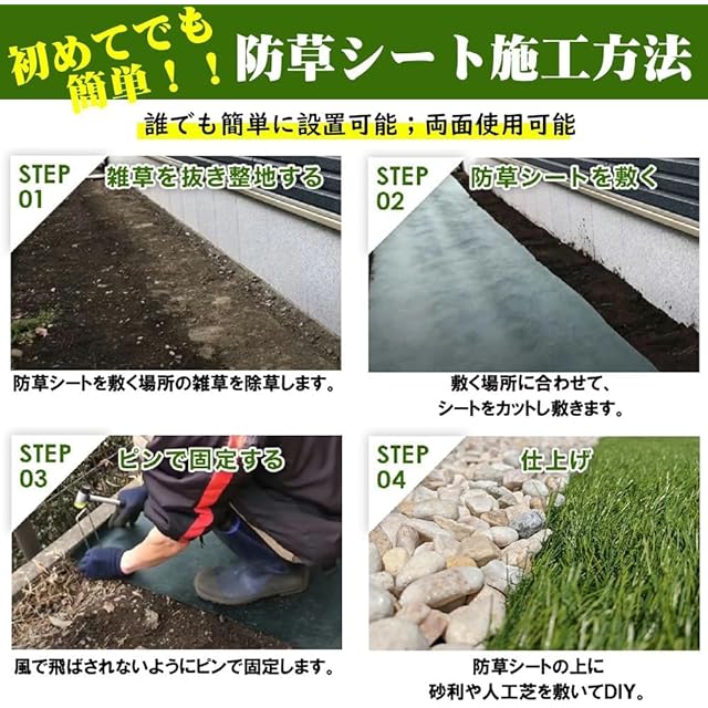 【商品仕様】防草シート 不織布:1 m x 30 m、重さ:約4000 g。固定ピン30本と黒丸30枚付き組み合わせて、より簡単に設置することもできます。スチール製ピン杭は表面に亜鉛メッキ加工を実施されたなので、腐食や錆びが起こりにくいです。防草シート 両面使用可能