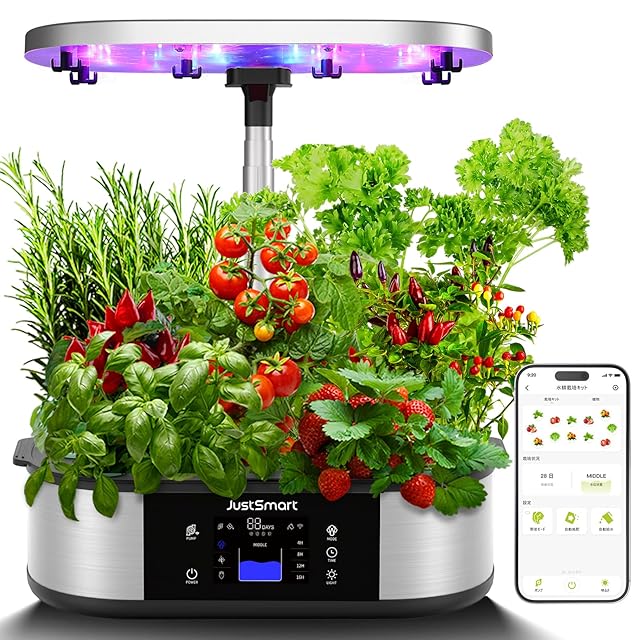 JustSmart 水耕栽培キット 室内 水耕栽培 スマートフォン連携 おしゃれ 家庭菜園 LEDライト付き タイマー/自動施肥/給水 循環式ポンプ ランプシェードの高さ調節可能 GS1 Plus