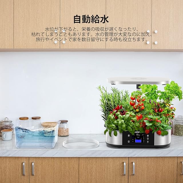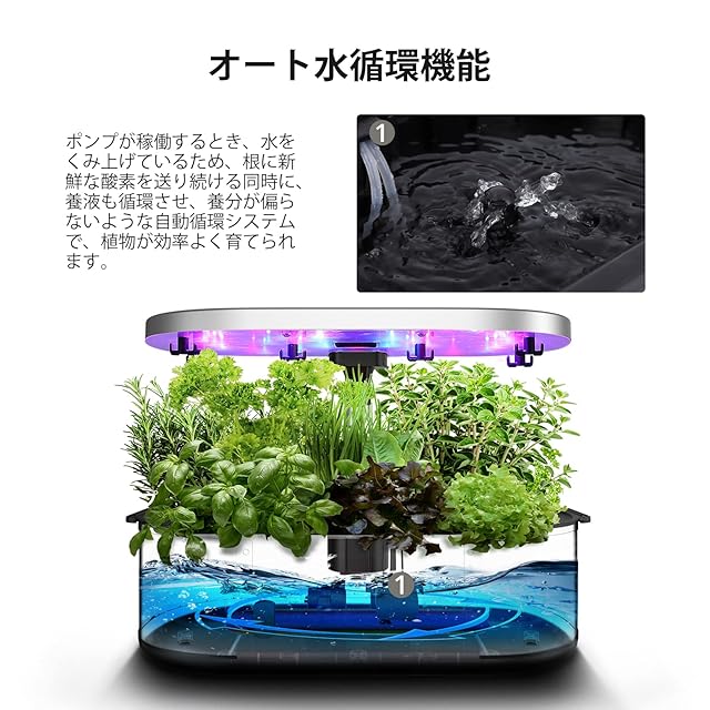 【スマートで革新的な機能満載】自動循環/自動施肥自動給水機能が搭載されています。植物ごとに最適な水・光・栄養量を自動調整できます。水中ポンプと換気ファンが搭載し、ポンプが稼働するとき、水をくみ上げているため、根に新鮮な酸素を送り続ける同時に、養液も循環させ、養分が偏らないような自動循環システムで、植物が効率よく育てられます。