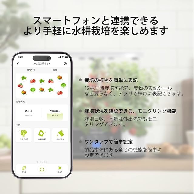 【オート水循環機能&超静音ポンプ】ポンプが稼働するとき、水をくみ上げているため、養液を均等に混ぜたり溶液中に酸素を溶かせるので、根腐れ防止に役立ちます。低騒音設計で作業音を最小限に抑えます。性能の安定性を保証する同時に、お客様の日常生活と睡眠にも面倒をかけないようにします。