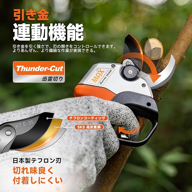 【33mm切断径、引金連動】:電動鋏KT 933は33mmの枝をスパスパ切れます。刃の開閉は引き金の引く強さでコントロールできますので、よりあんぜん、より繊細な剪定作業が実現できます。