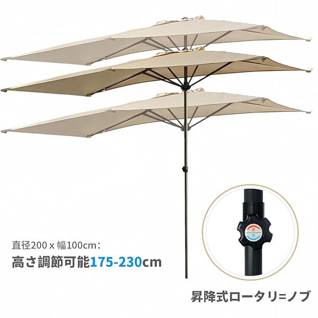 ガーデンパラソル 長方形 パラソルハ 直径200x幅100cm 角度調整可能 UVカット 風に強い撥水加工 高さ調節可能175-230cm 簡単な組み立 日よけ 庭 テラス屋根 プール カフェ ビーチ (カーキ, 角度を左右に調整できる)