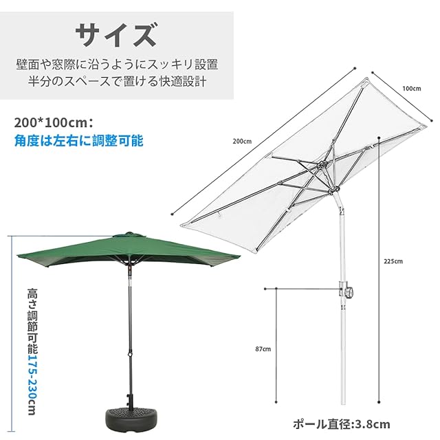 【高さ調節可能】ガーデンパラソルの高さは調整可能です。必要に応じて遮陽傘の高さを調整することができ、より優れた遮陽効果を得ることができます。取り外し可能、収納が簡単。直径200x幅100cm:高さ調節可能175-230cm。