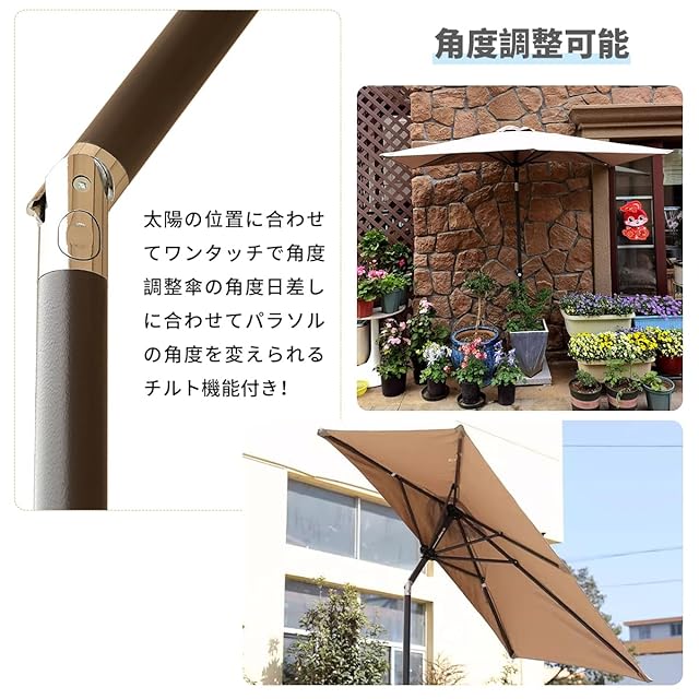 【角度調整可能】 屋外ガーデンパラソル高さ調整と傾斜ボタンの機能を同時に持つことができ、日差しの向きに合わせて、パラソルの角度を簡単に調節することが可能で、手軽に日差しを遮ることができます。 トップボタンはワンタッチで簡単に開き、操作にハンドルは必要ありません。
