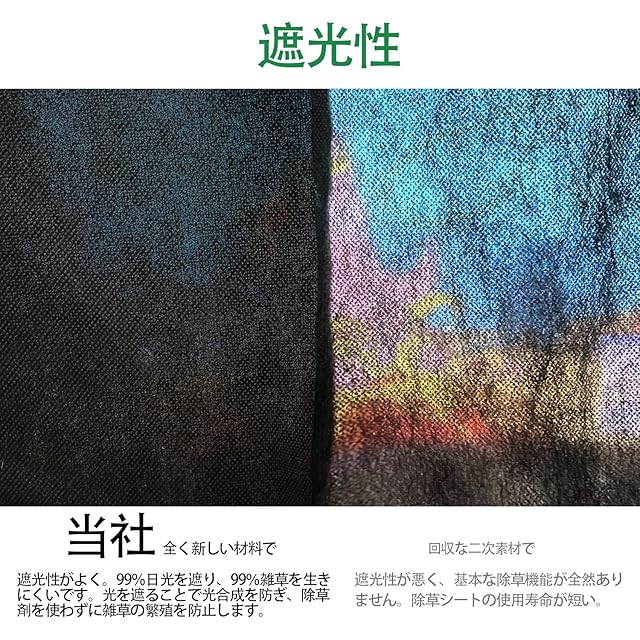 【遮光性アップ! 】高品質の耐候性不織布を採用して、日光を遮り、雑草を生きにくいです。光を遮ることで光合成を防ぎ、除草剤を使わずに雑草の繁殖を防止します。水や空気、液体肥料を通すので植栽もできる防草シート(雑草防止シート)です。 除草剤に頼らないため、大切な庭木や花壇などの枯らしたくない植物に影響しません。安全性の高い雑草対策です。