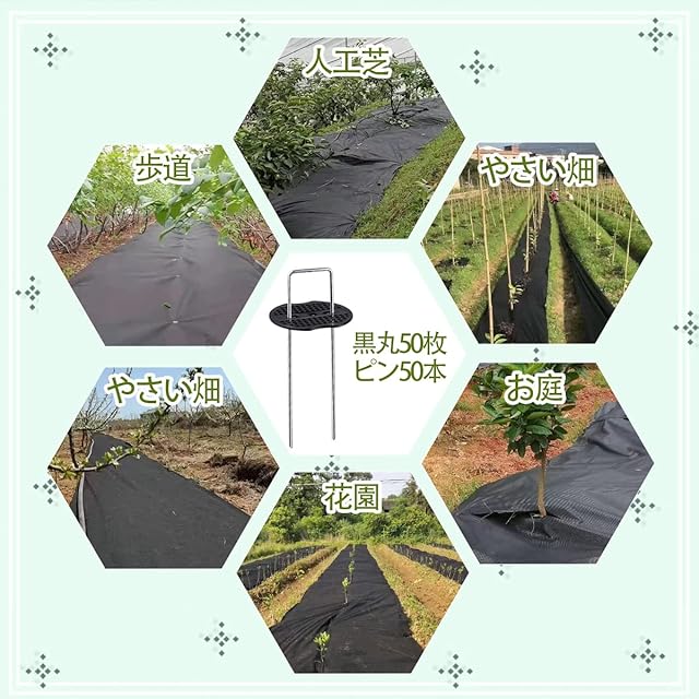 【防草シート詳細】サイズ:1m×50m;材質:ポリプロピレンスパンボンド不織布(耐侯剤と親水剤配合) 高密度120g/㎡;スチール製Uピン50本+50枚黒丸で合計100点セットです。固定ピン長さ:15cm。両面使用可能
