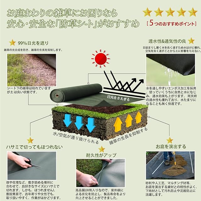 【耐久年数:5年】高面密度100g/m²の高品質ポリプロピレン(UV耐候剤配合)を使用し、従来の除草シートに比べて厚みがあるので破れにくく丈夫です。また、U V剤入りなので、紫外線による劣化を防止します。 耐用年数は5年で除草(雑草取り)作業の手間を省きます。 ※使用環境などによって差が出る場合があります。