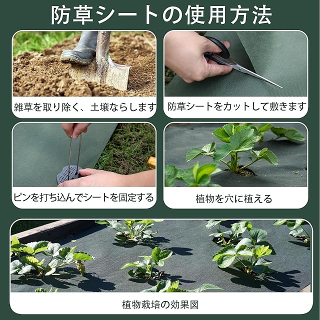 【幅広く使用】防草シートを手軽に切断でき、切り端が綺麗でほつれない。数枚防草シートを合わせてご利用可能、サイズを簡単に調整して、より便利に設置できます。防草シートは環境を汚染せず、建物まわり(庭、通路、物干し場、ウッドデッキの下、駐車場(ガレージ))、路肩、畑、菜園、 果樹園、花壇、空き地、墓地(墓石まわり)などに幅広く使用できます。