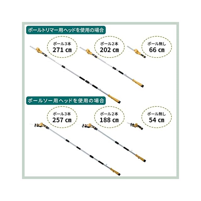 【特徴】バッテリー式で電源を気にせずに使用できる高枝ガーデンポールソーです。切断する枝の高さに合わせて着脱ポールの接続本数を変更することで3段階の高さ調節ができます。「伸長タイプ」ではなく「ポール継ぎタイプ」なので、先端に重量負担が掛かりにくい構造に加え、約2kgの軽量タイプなので作業も快適に行えます。太枝は最大約80mmの硬い枝で約26本切断が可能で、付属の枝キャッチャーを使用すれば細い枝の切断も簡単です。木の枝や切断した枝のカットなどは本体のみでの使用が最適です。トリガースイッチでスピード調節も出来るので、快適に剪定作業が行えます。