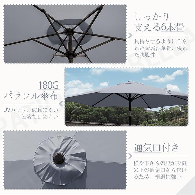 【商品仕様】:「サイズ」直径270cm×高さ237.5Cm 「中棒の直径」38mm 「傘生地」180Gポリエステル 「傘骨」8本 *ディスプレイや写真の光の加減や角度により実物の色が多少異なる場合があります。ご注意:本製品はパラソル本体のみ、ベースは別売りです。