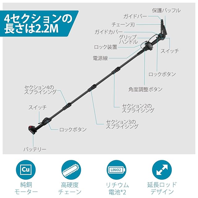 POXITY 高枝切り電動チェーンソー たかえだ 電動 チェーンソー 4段階伸縮延長ポール 最長2.2m 6インチ 高枝 チェーンソー 角度調節可能 強力 木工切断 2個大容量バッテリー コードレス 電動高枝切りチェーンソー 高枝伐採 パワフル プロ伐採 園芸(4段セット) | ascend